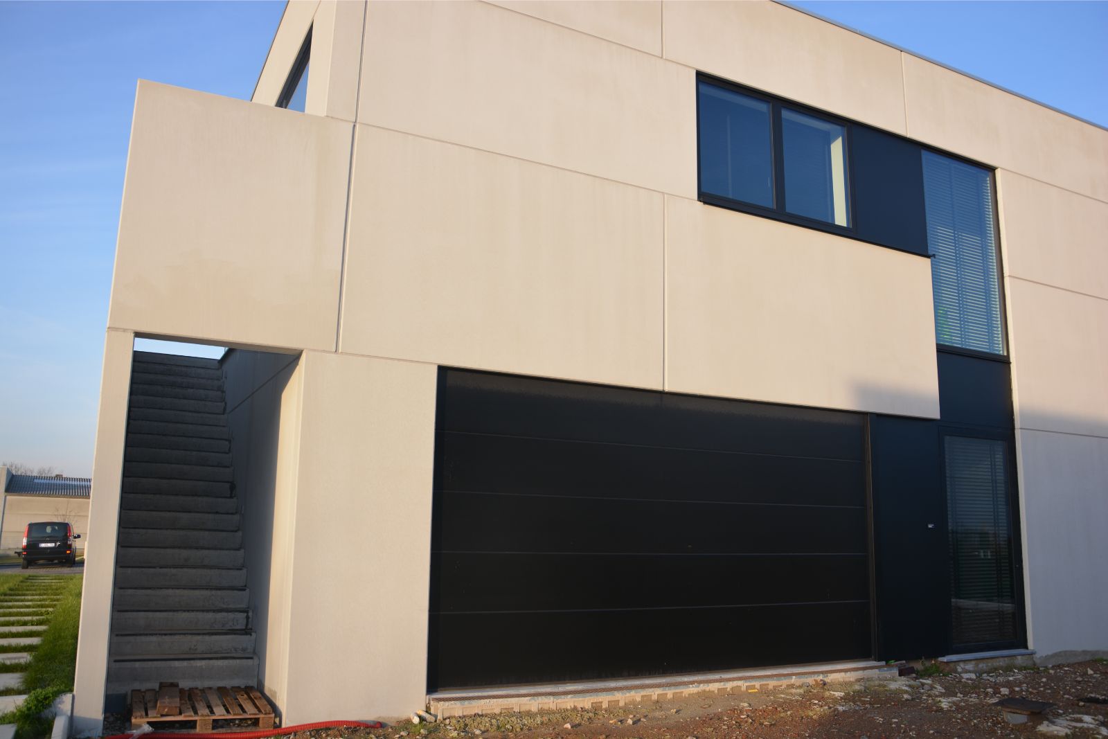 Het werd en plek met een duidelijke scheiding tussen werk en privé, met een uitzicht over de velden, ideaal om tot rust te komen. Zowel de bedrijfsuitbreiding als de woning hebben een industriële look en karakter. Daar zorgen de gietvloeren, open ruimtes, plafondhoge ramen en deuren voor.